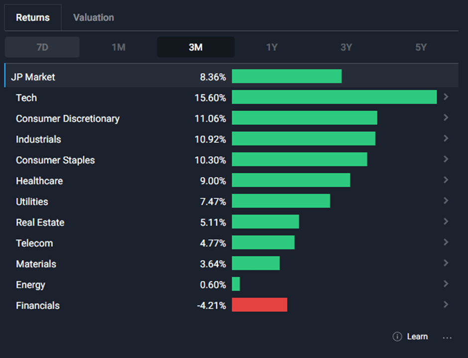 So, which are the sectors in Japan that helped it to gain to a 30-year high? In the last 3 months, the technology sector was the highest performing, rising by 15.6%. This was followed by the consumer discretionary (11.1%), industrials (10.9%), and consumer staples (10.3%) sectors.