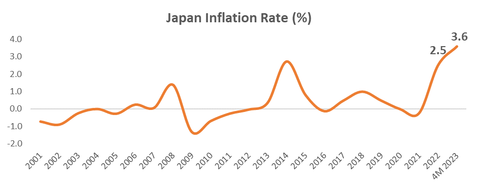 As mentioned previously, the return of higher inflation to Japan is good news. Inflation rose to 2.5% in 2022 from a decline of 0.3% in 2021 and has continued to rise to an average of 3.6% in the first 4 months of 2023.