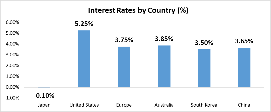 Lastly, believe it or not. Japan is one of the few countries in the world that have not aggressively raised interest rates. Countries like the U.S. and Europe have done so as inflation rates were very high in both the years 2022 and 2023.