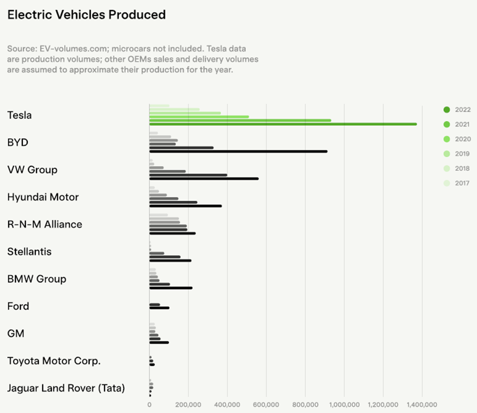 Production-wise, Tesla is far ahead of its second biggest EV player, BYD. In 2022, it produced about 1.3 million EVs. Interestingly enough, it made US$1.8 billion in revenue from selling carbon credits to other equipment manufacturers. Huh?