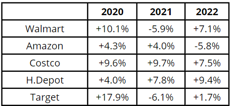 Let’s look at this systematically. What are the biggest retailers in the U.S.? The top 5s are Walmart, Amazon, Costco, Target, and Home Depot. For Walmart, Costco, Target and Home Depot, you might have imagined the pictures of a big crowd of people rushing into their stalls. For Amazon, it’s also the same thing when too many people are checking out it slows the website down to a halt. Here’s how much these companies made in revenue in 2022.