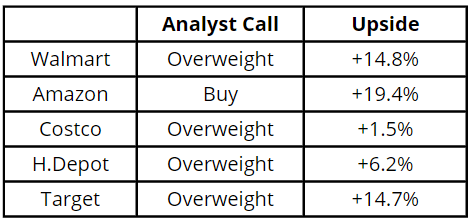 I know. This is not a complete analysis of cause and effect. Just because the company gained in the month of November, it does not mean that it was due to Black Friday. However, the sentiments surrounding Black Friday sales for these companies are crucial determinants of their share price performance during the month. Only Home Depot and Costco showed a consistent rise in share prices during the month. Walmart, Target and Amazon were mixed in this regard, with one year of declines. At least from this limited data set, there is a case to make for a short-term investment/trading strategy of investing at the beginning of the November month and divesting by the end of it. However, it will also be wise to look at the WSJ analyst forecast to gauge the upside.