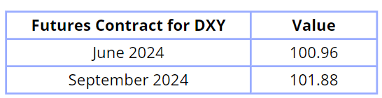Dollar index futures for June 2024 (100.96) and Sep 2024 (101.88) indicate further weakening in the dollar from the current 102.18.