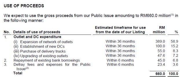 It will utilise RM220 million to as capital expenditures for the outlets (to buy equipment and renovate) and RM169 million for inventory. The inventory part reminds me of how Farm Price used 43% of its IPO money to buy inventory to stock up. 99 is using about a quarter of them. I don’t like it, but it seems that this is an industry norm.