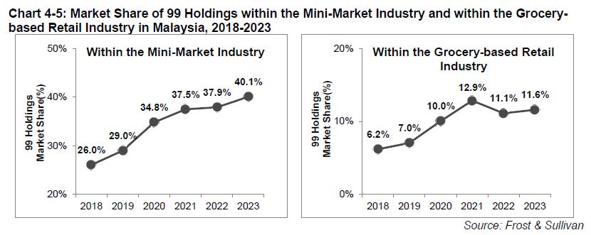 And 99 is close to one. According to data from Frost and Sullivan, 99 make up about 40% of Malaysia’s mini-market industry and 12% of the grocery-based retail industry.