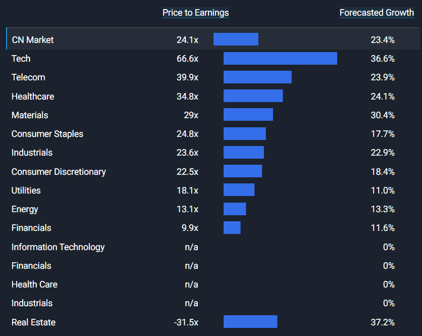 Chinese stocks have traded downward back to their average price-to-earnings ratio of 23.9 times after rising to 25.3 times over the past two weeks. Here is a quick snapshot of the sectors valuation.