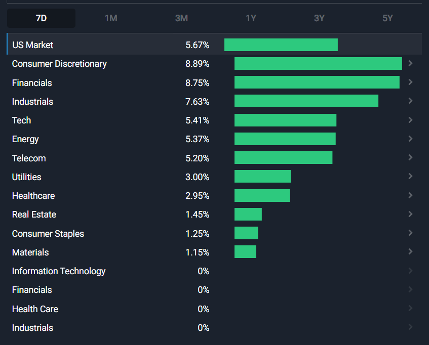 The S&P 500 rose by 4.6% to end last week at 5,995. Of note, the consumer discretionary, financials, industrial, technology, and energy sectors drove most of the gains according to data from SimplyWallSt.