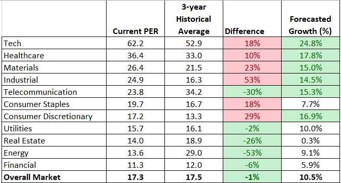 Let’s start from the big picture. SimplyWallSt has a very useful table that gives the sectors’ valuations and forecasted profit growth for the year. Here it is.