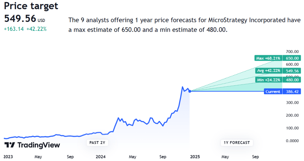 However, analysts in the market expect bullish things from Micro Strategy. They have set an average target price of US$550, with an implied upside of 42%.