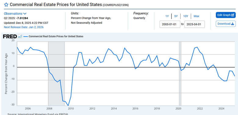 But residential properties are not the only ones in the U.S. It also has commercial properties. Based on FRED, commercial property prices declined by 7% in 2Q 2025, and have been declining since 3Q 2023 (-0.9%).