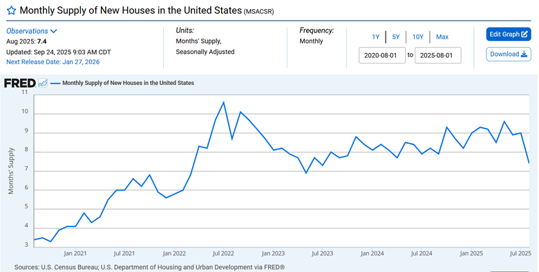 The supply of housing in the United States has been really strong in the past three years. While the growth dropped to 7.4% in August 2025 from 9.0% in July 2025, it has averaged around 8.3% every quarter since January 2022.