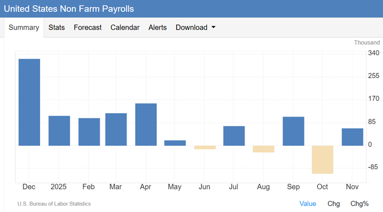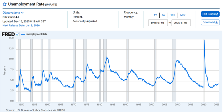 The unemployment rate has increased to 4.6% in November from 4.4% in September 2025. Concerning, but not disastrous, as it has been higher before this.