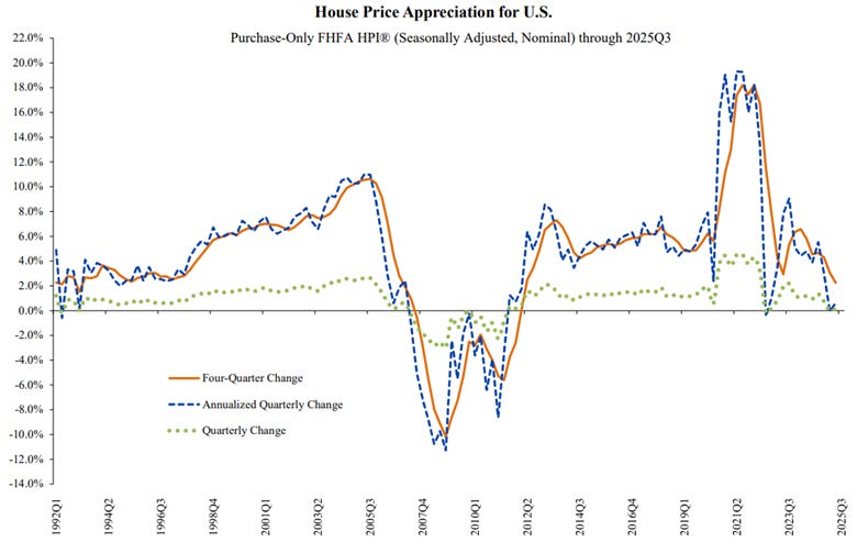 This is the house price changes from the Federal Housing Finance Agency (FHFA), which indicates that house price growth has softened to 2.2% in 3Q 2025 from 3.1% in 2Q 2025. House price growth has been on a steady decline since reaching a peak of 18.2% in 1Q 2022.