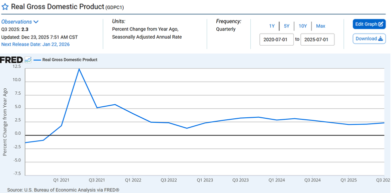 Lastly, gross domestic product growth was at 2.3% in 3Q 2025 – not bad, but not great either. This is quite in line with the historical average of 2.0%.