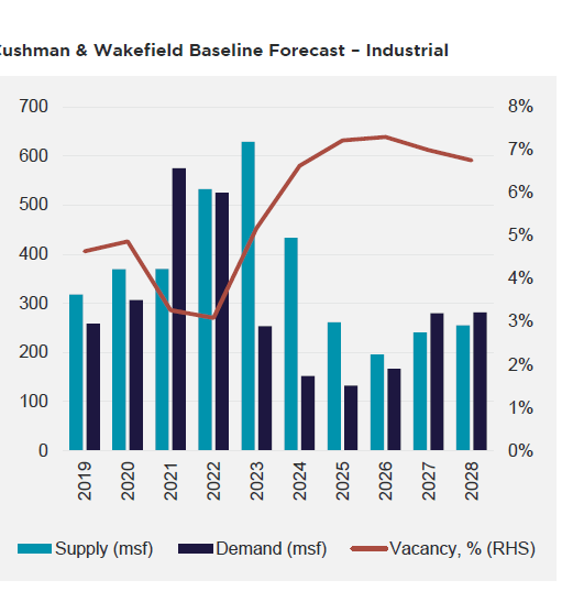 However, that has changed slightly. Residential starts (new construction) are projected to fall to two-thirds from their peak, the lowest level since 2012 (Cushman & Wakefield, 2025).