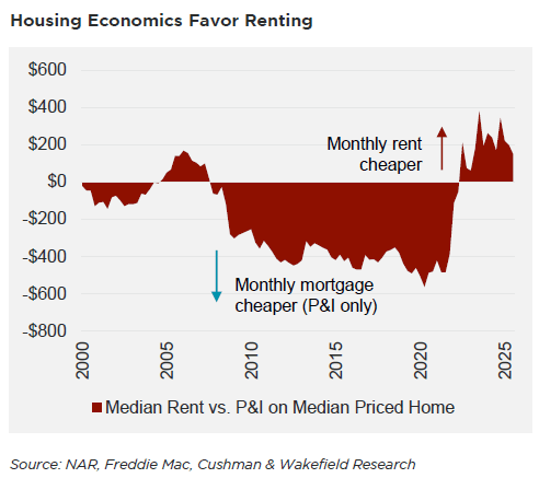 Thinking about it more now, it is not surprising. The Federal Reserve has raised interest rates since 2022 to bring inflation down. And that has increased most Americans’ loan repayment for a house. As a result, property prices have been depressed in the past couple of years, with U.S. builders continuing to build more houses. Rent also has softened as apartment owners have decided to keep rents for new leases low to attract tenants (Cushman & Wakefield, 2025).