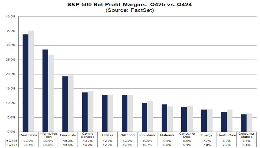 The difference is too minute. To me, there wasn’t really any difference in profit margins between 2024 and 2025. You can make the argument that the consumer discretionary (2025:8.5%; 2024: 9.1%) and staples (2025: 6.1%; 2024: 6.4%) sectors saw declines in profit margins, but they seem to be quite small.