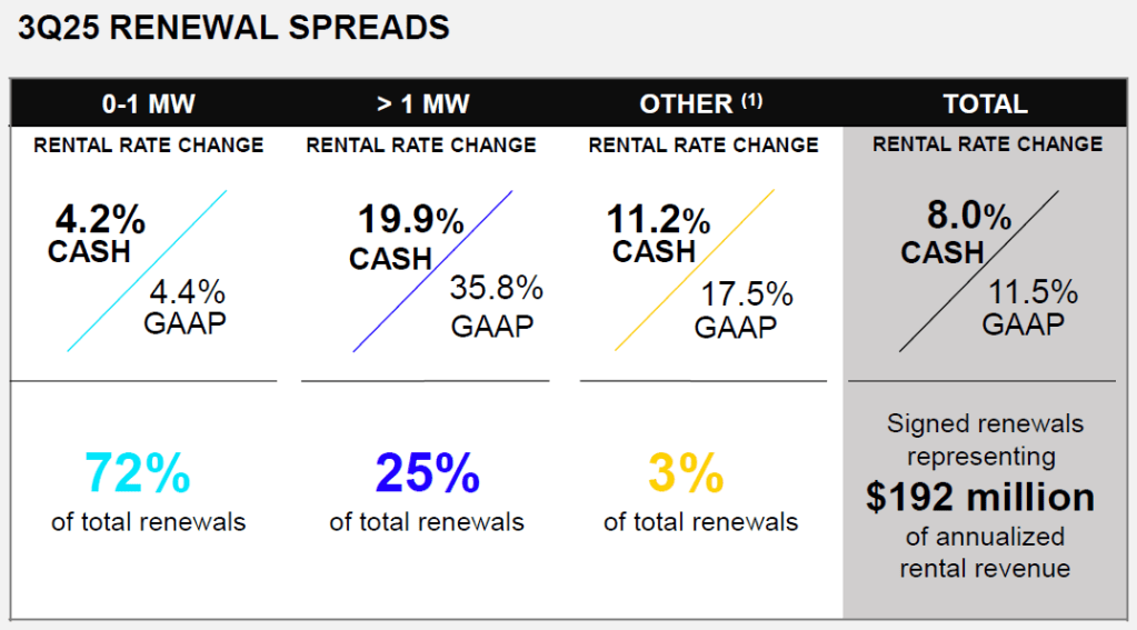 I interpret this as a small risk in the big scheme of things. But as I read further, I am comforted by the fact that its renewal rates are growing steadily. It has been able to record 11.5% increase in rental rates for 3Q 2025, driven mainly by more than 1 MW customers (+36%). Meanwhile, 0 to 1 MW renewals show only around a 4.4% increase.