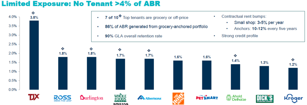 Kimco Realty is a REIT that owns and operates grocery-anchored shopping centres and properties in American suburbs. Kimco has a half-half mix between anchor and small shop tenants, where 86% of annual base rent is generated from anchor tenants. It operates around 560 properties situated in the sun-belt and coastal areas.