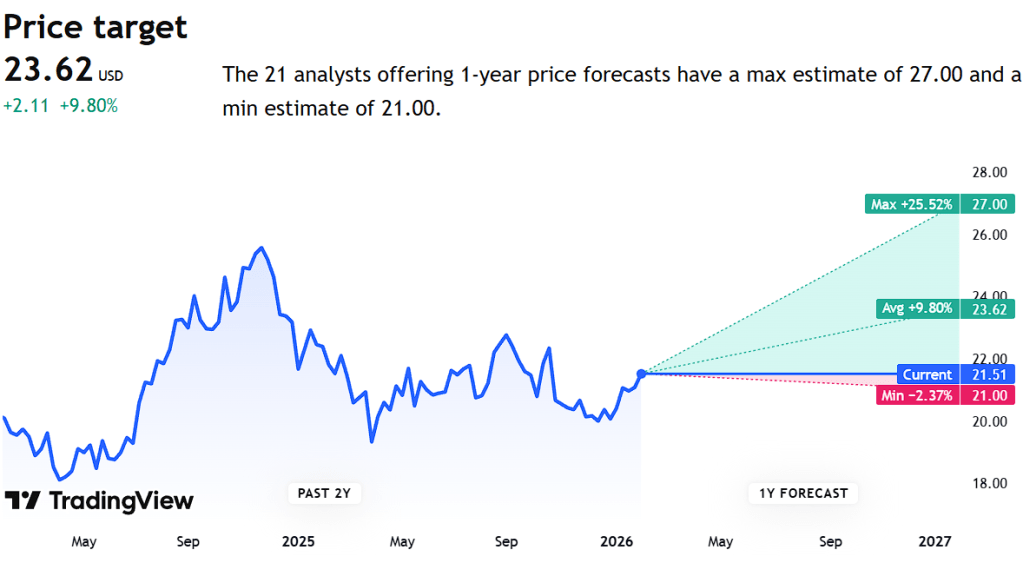Trading View has the company at a target price of $23.62 with an implied upside of +9.8%.
