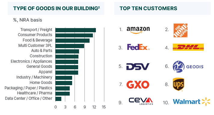 Prologis is a logistics real estate investment trust that has operations mainly in the United States (about 85% of operating income). It mainly serves customers in the transport & freight, consumer products, food & beverage, and auto parts sectors, with top clients such as Amazon, FedEx, and Walmart.