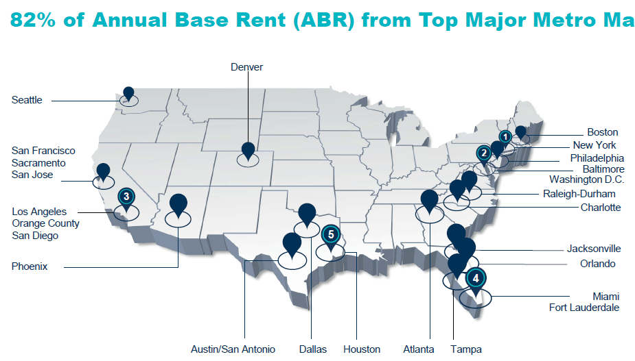 One, its exposure is wide … very wide in the United States, which makes it an ideal logistics REIT. 19% of its assets are situated in Southern California, which basically means Los Angeles. New York City is at 8.5%, followed by Chicago (5.6%), Florida (4.6%), San Francisco (4.4%) and Dallas (5.1%). These are the main cities in the United States that are the centre of trade with the rest of the world.