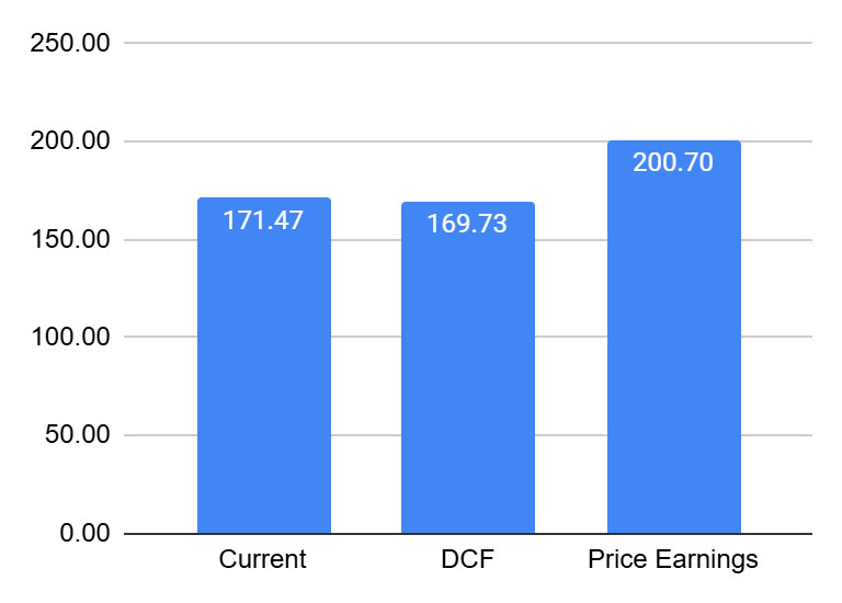 Based on the DCF valuation (Excel file here), Exxon does look fairly valued at the current stage. For the price-earnings assumption, I obtained its peers’ average price-to-earnings ratio of 30 times, and indicates that Exxon could trade at $200.7.